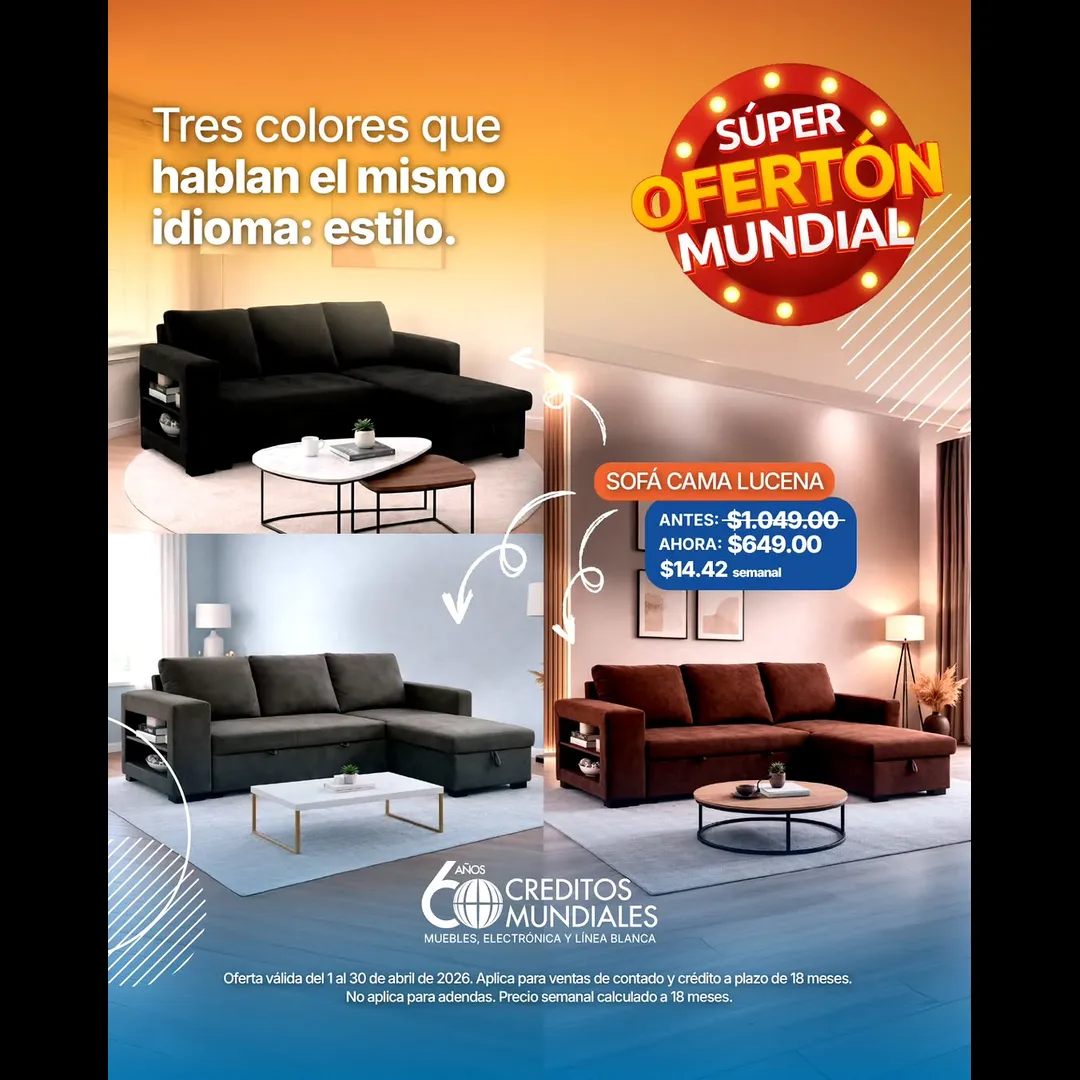 Compra en línea https://creditosmundiales.com o visita nuestras tiendas. Válido del 1 al 30 de abril.