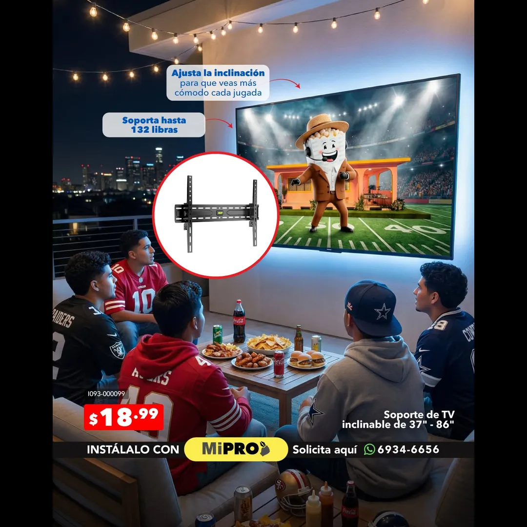 📺 Acompáñala con el soporte de TV inclinable de 37” a 86” Dura+, diseñado para pantallas grandes, resistente y perfecto para sala o terraza, logrando el ángulo de visión ideal para disfrutar el partido sin reflejos.