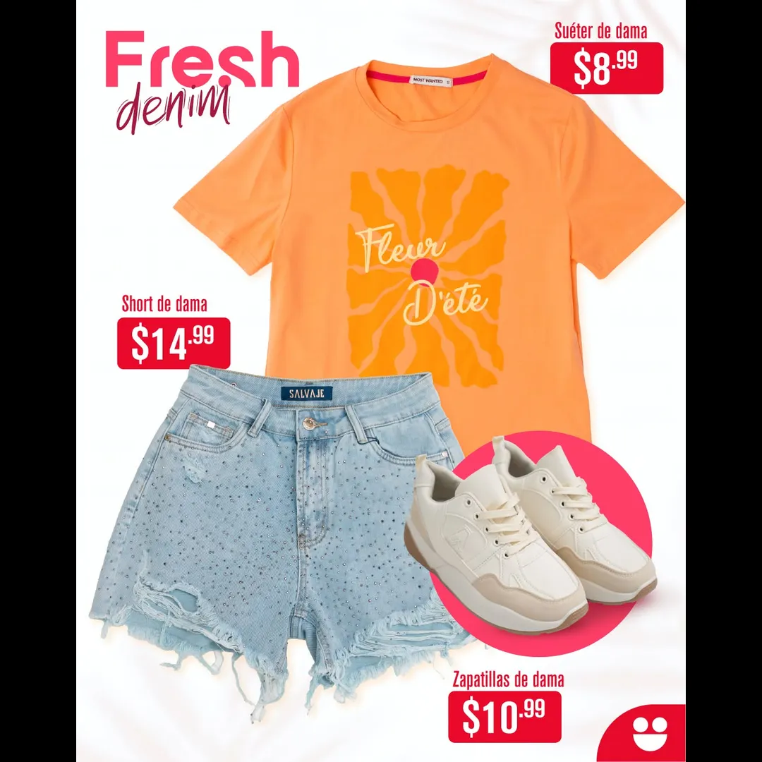 Un look que grita verano 🍊✨ Camiseta vibrante, short denim con detalles que enamoran y sneakers que combinan con todo. 🤩