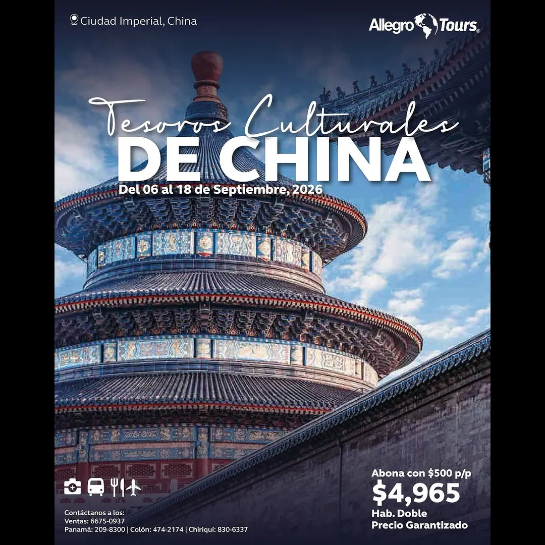 Este programa incluye vuelos internacionales, trenes de alta velocidad, hoteles con desayuno, tours guiados, traslados, visitas a íconos como la Gran Muralla China, la Ciudad Prohibida, los Guerreros de Terracota, Shanghái y Hong Kong, además de seguro de asistencia de viaje.