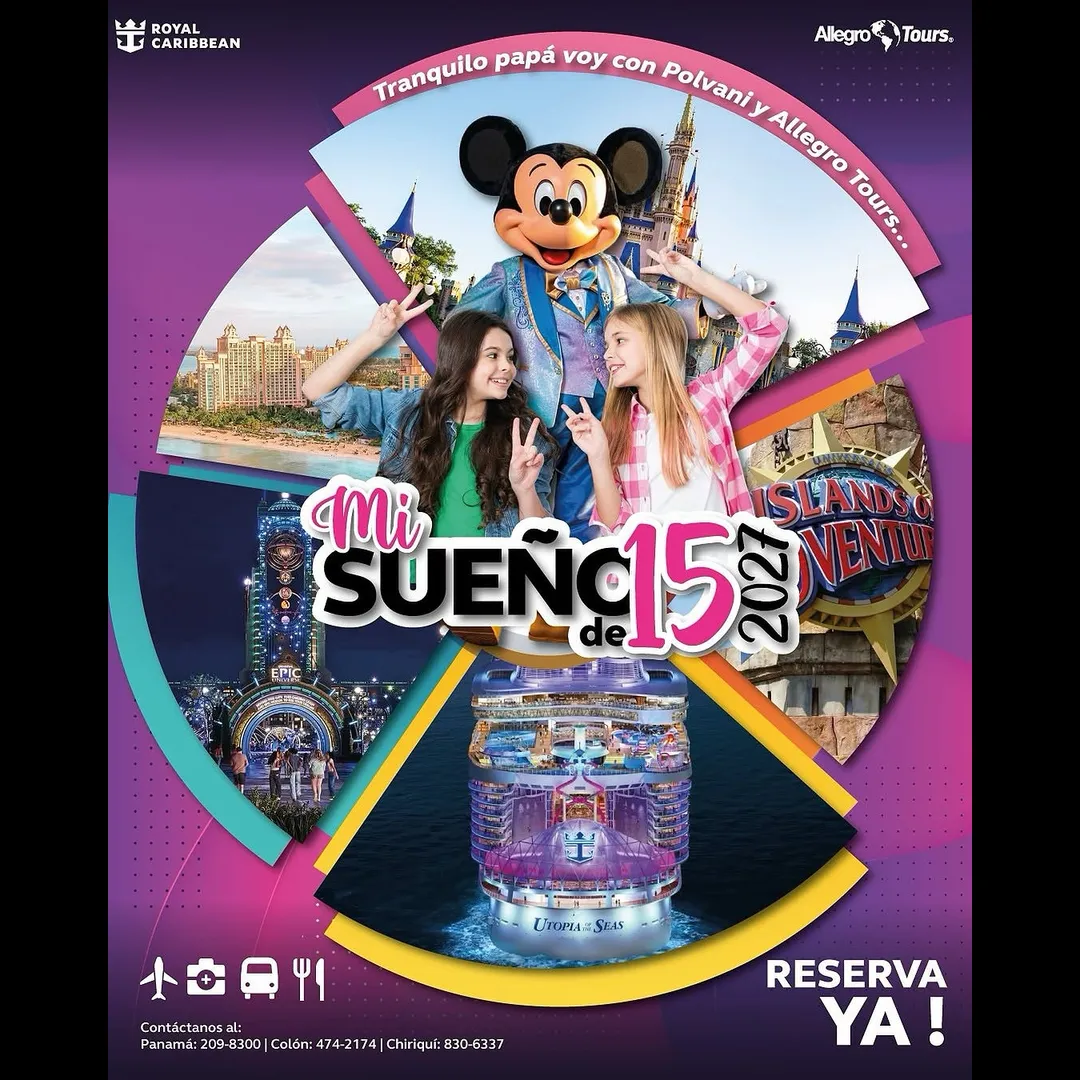 Hay momentos que merecen celebrarse a lo grande, y tus 15 años son uno de ellos. Allegro Tours te invita a vivir una experiencia única, llena de magia, aventuras y sonrisas, con nuestro Paquete Quinceañeras – 20 al 29 de enero de 2027. Un viaje diseñado para que cada día sea especial, combinando crucero, parques temáticos, diversión sin límites y recuerdos que te acompañarán para siempre.